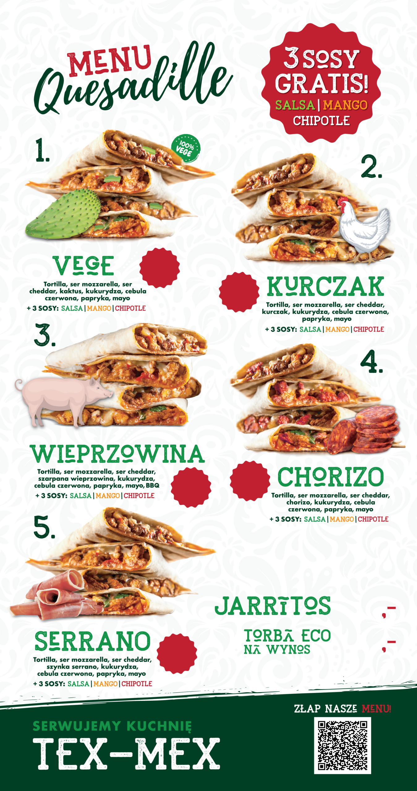 Mexico FoodTruck to esencja meksykańskich smaków! Serwujemy aromatyczne quesadille w kilku opcjach: vege z kaktusem, soczystym kurczakiem, marynowaną wieprzowiną, chorizo lub szynką serrano. Każde danie podajemy z trzema pysznymi sosami. Meksyk na wyciągnięcie ręki!